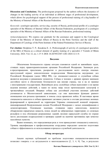 Обсуждение и заключения. Предложенная авторами профессиограмма отражает динамику изменения ведущей деятельности личности на разных стадиях профессионального становления, что позволяет осуществлять психологическое сопровождение процесса профессиональной подготовки специалиста-кинолога МВД РФ.