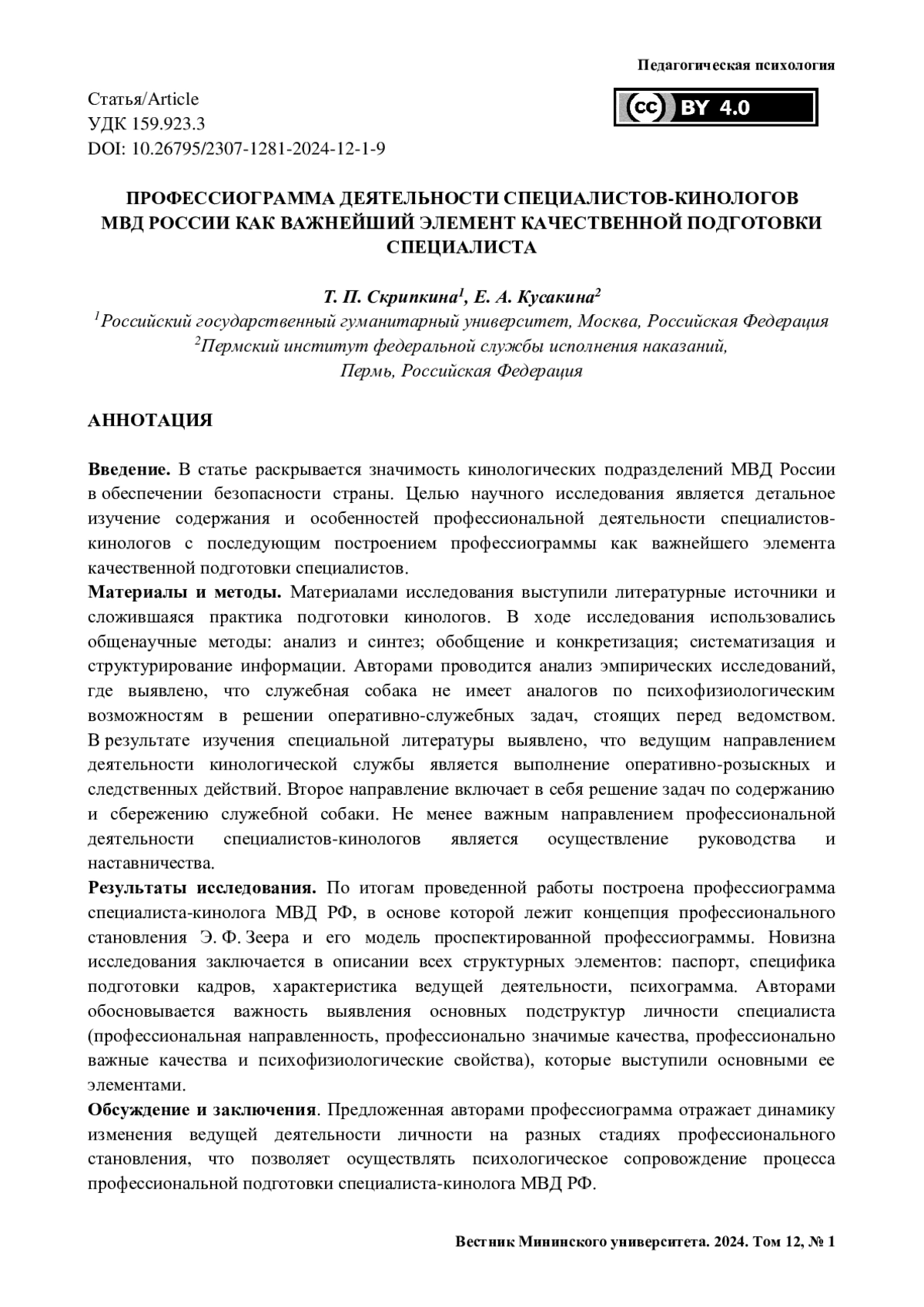 12. Кусакина Е. А. Профессиональная компетентность специалистов-кинологов и условия ее формирования // Мир науки, культуры, образования. 2020. № 6. С. 322-324.