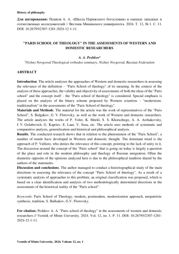 Введение. В статье анализируются подходы западных и отечественных исследователей в оценках релевантности определения – «школа Парижского богословия». В контексте анализа этих подходов рассматривается правомочность и объективность оценок как идей «парижской школы», так и самого концепта «школа Парижского богословия». Особый акцент делается на анализе предложенной западными учеными бинарной схемы «модернизм-традиционализм» в оценках «Парижской школы богословия».