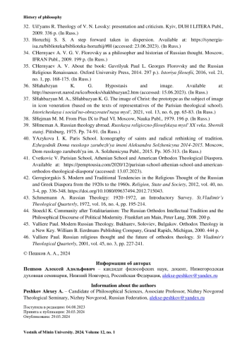 23. Пешков А. А. Современная оценка концепции неопатрического синтеза Г. В. Флоровского в контексте модернизационного подхода // Вестник Мининского университета. 2022. Т. 10, № 1. С. 10.