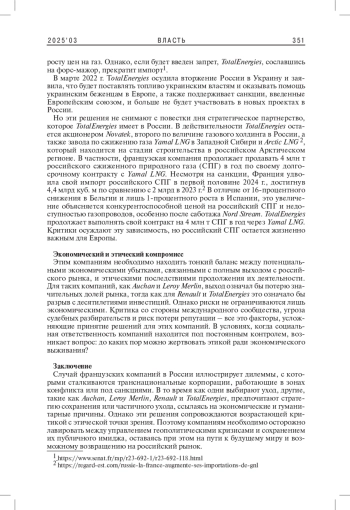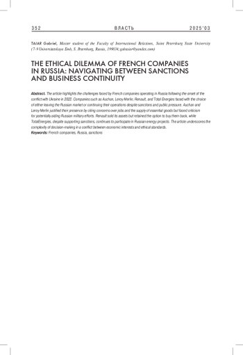 ТАЙЯР Г. ЭТИЧЕСКАЯ ДИЛЕММА ФРАНЦУЗСКИХ КОМПАНИЙ В РОССИИ: НАВИГАЦИЯ МЕЖДУ САНКЦИЯМИ И ПРОДОЛЖЕНИЕМ БИЗНЕСА // ВЛАСТЬ. 2025. ТОМ 33 № 3