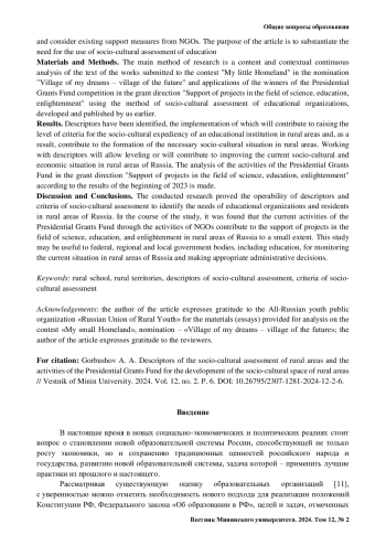 ГОРБУШОВ А. А. ДЕСКРИПТОРЫ СОЦИОКУЛЬТУРНОЙ ОЦЕНКИ СЕЛЬСКИХ ТЕРРИТОРИЙ И ДЕЯТЕЛЬНОСТЬ ФОНДА ПРЕЗИДЕНТСКИХ ГРАНТОВ ПО РАЗВИТИЮ СОЦИОКУЛЬТУРНОГО ПРОСТРАНСТВА СЕЛЬСКОЙ МЕСТНОСТИ // ВЕСТНИК МИНИНСКОГО УНИВЕРСИТЕТА. 2024. ТОМ 12, № 2