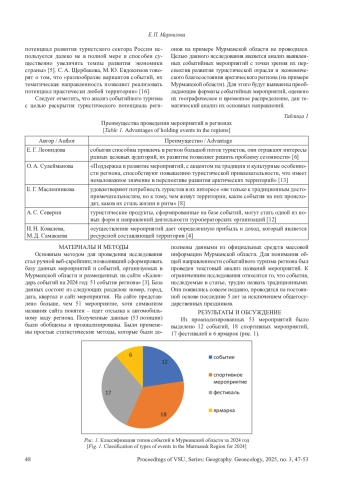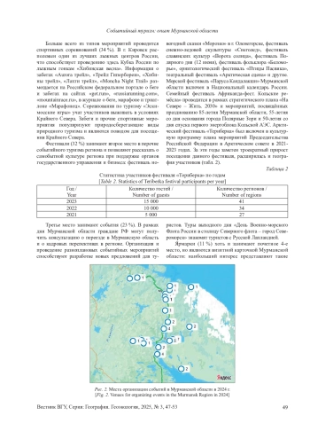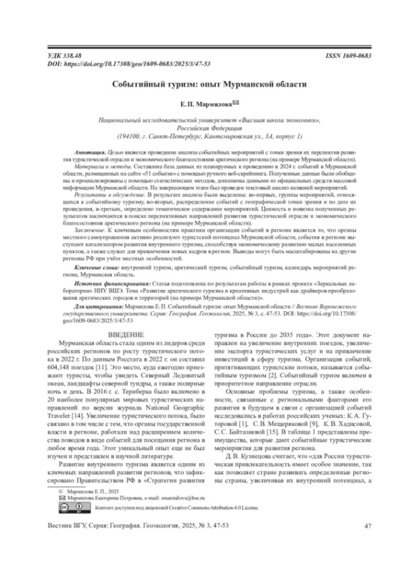 Целью является проведение анализа событийных мероприятий с точки зрения их перспектив развития туристической отрасли и экономического благосостояния арктического региона (на примере Мурманской области). Материалы и методы. Составлена база данных из планируемых к проведению в 2024 г событий в Мурманской области, размещенных на сайте «51 событие» с помощью ручного веб-скрейпинга. Полученные данные были обобщены и проанализированы с помощью статистических методов, дополнены данными из официальных средств массовой информации Мурманской области. На завершающем этапе был проведен текстовый анализ названий мероприятий. Результаты и обсуждение. В результате анализа были выделены: во-первых, группы мероприятий, относящихся к событийному туризму, во-вторых, распределение событий с географической точки зрения и по дате их проведения, в-третьих, определено тематическое содержание мероприятий. Ценность и новизна полученных результатов заключаются в поиске перспективных направлений развития туристической отрасли и экономического благосостояния арктического региона (на примере Мурманской области). Заключение. К ключевым особенностям практики организации событий в регионе является то, что органы местного самоуправления активно реализуют туристский потенциал Мурманской области, события в регионе выступают катализатором развития внутреннего туризма, способствуя экономическому развитию малых населенных пунктов, а также служат для привлечения новых кадров в регион. Выводы могут быть масштабированы на другие регионы РФ при учёте местных особенностей.