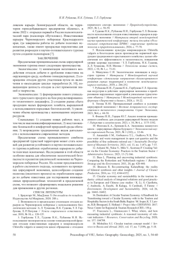 7. Рубановат Н. И., Гудкова Н. К., Горбунова Т. Л. Креативная индустрия в действии: циркулярная экономика и преобразование нарушенных территорий в уникальные туристические объекты II Материалы I Международной научной конференции “Творчество и бизнес”, 2024, с. 18-22.