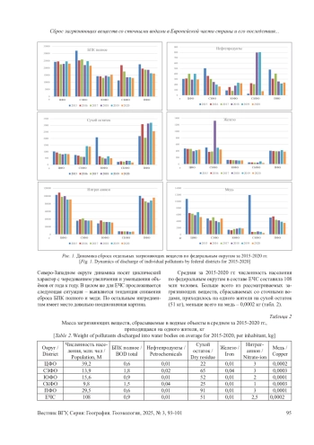 Целью статьи является комплексный анализ состава и объемов загрязняющих веществ (ЗВ), поступающих в водные объекты со сточными водами в федеральных округах и ряде крупных речных бассейнов (Невы, Северной Двины, Волги, Оки, Камы, Дона, Кубани) Европейской части России (ЕЧС) в 2015-2020 гг., и сопоставление сброса ЗВ с фактическим содержанием их в речных водах. Материалы и методы. Исходными материалами послужили данные о годовом сбросе ЗВ по субъектам и федеральным округам в составе ЕЧС и сведения об их средней годовой концентрации в речных водах, содержащиеся в статистических справочниках. Рассматривается содержание БПК полного (показателя органических веществ), нефтепродуктов, сухого остатка (минерализации), железа, нитрат-аниона, меди. Применен метод географо-гидрологического сопоставления. Результаты и обсуждение. Показано, что федеральные округа существенно различаются между собой как по величине общего сброса отдельных ЗВ, сбрасываемых со сточными водами, так и приходящегося на одного жителя, км2 площади и км3 местного речного стока. Не выявлено какой-то общей явно выраженной тенденции в величине сброса ЗВ в 2015-2020 гг. Вместе с тем выявляется превышение ПДК в большинстве замыкающих створов рассматриваемых речных бассейнов и значительное превышение фактического годового выноса ЗВ, в том числе сверхнормативного, по сравнению с годовым сбросом со сточными водами. Выводы. Значительное превышение фактического годового выноса ЗВ в замыкающих створах речных бассейнов над сбросом их со сточными водами свидетельствует о преобладающем вкладе в загрязнение рассматриваемых водных объектов других источников, прежде всего диффузного стока с водосборов.