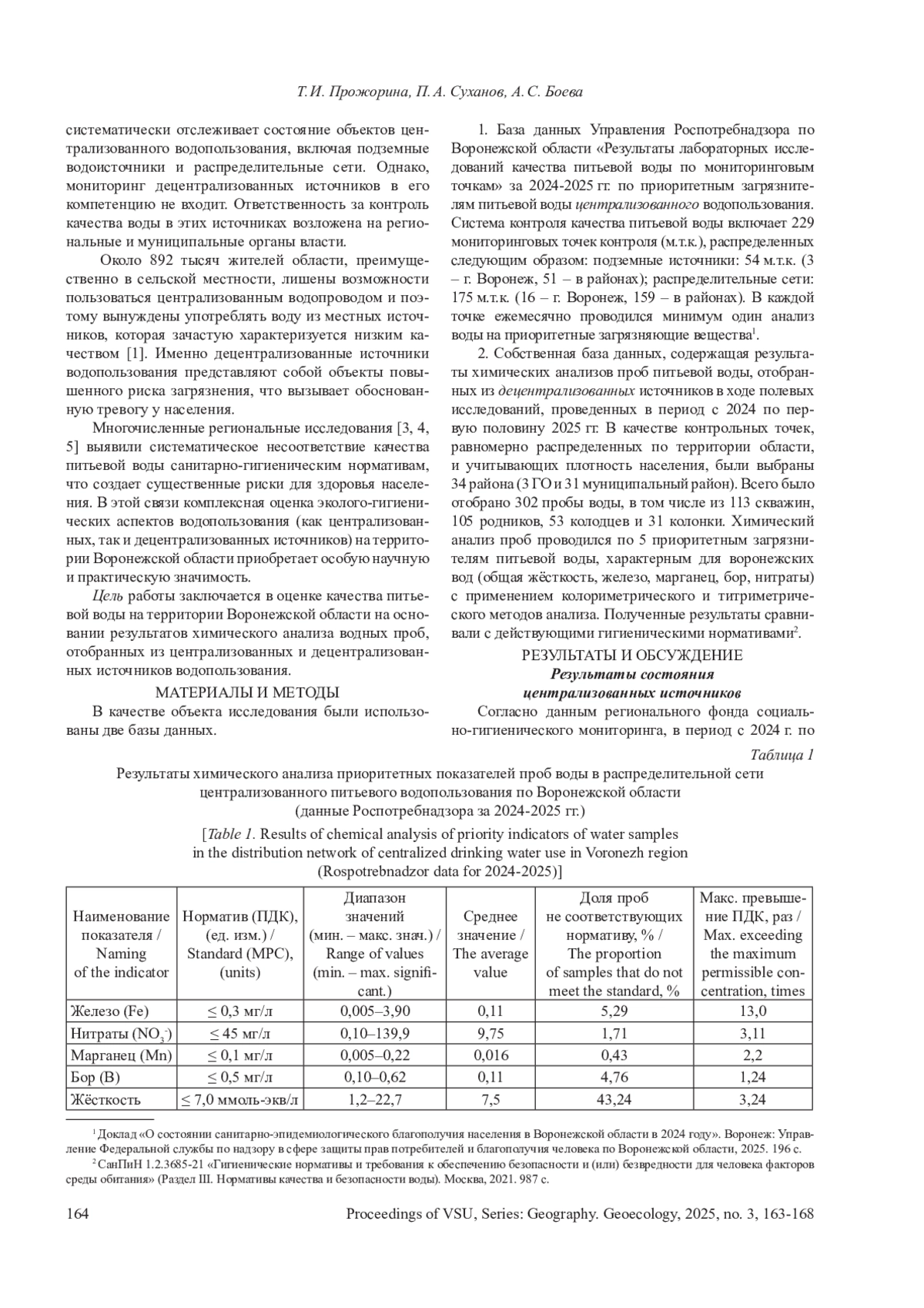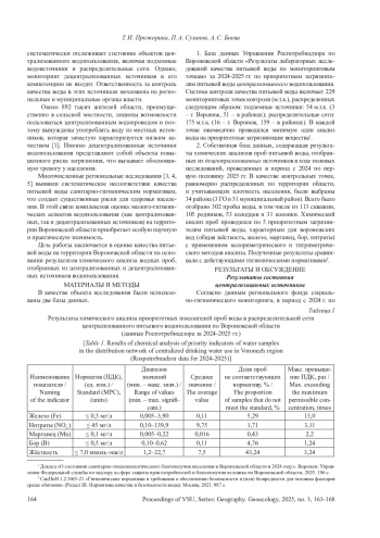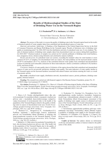 ПРОЖОРИНА Т. И., СУХАНОВ П. А., БОЕВА А. С. РЕЗУЛЬТАТЫ ГИДРОЭКОЛОГИЧЕСКИХ ИССЛЕДОВАНИЙ СОСТОЯНИЯ ПИТЬЕВОГО ВОДОПОЛЬЗОВАНИЯ НА ТЕРРИТОРИИ ВОРОНЕЖСКОЙ ОБЛАСТИ // ВЕСТНИК ВОРОНЕЖСКОГО ГОСУДАРСТВЕННОГО УНИВЕРСИТЕТА. СЕРИЯ: ГЕОГРАФИЯ. ГЕОЭКОЛОГИЯ. 2025. № 3