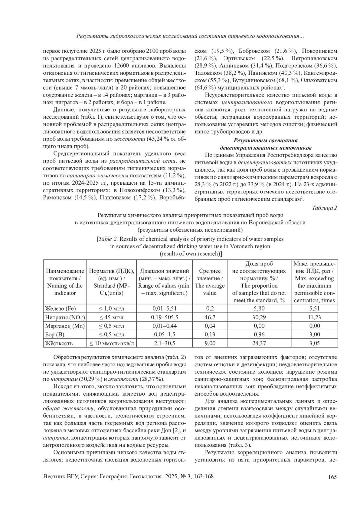 Статья: РЕЗУЛЬТАТЫ ГИДРОЭКОЛОГИЧЕСКИХ ИССЛЕДОВАНИЙ СОСТОЯНИЯ ПИТЬЕВОГО ВОДОПОЛЬЗОВАНИЯ НА ТЕРРИТОРИИ ВОРОНЕЖСКОЙ ОБЛАСТИ (2025)