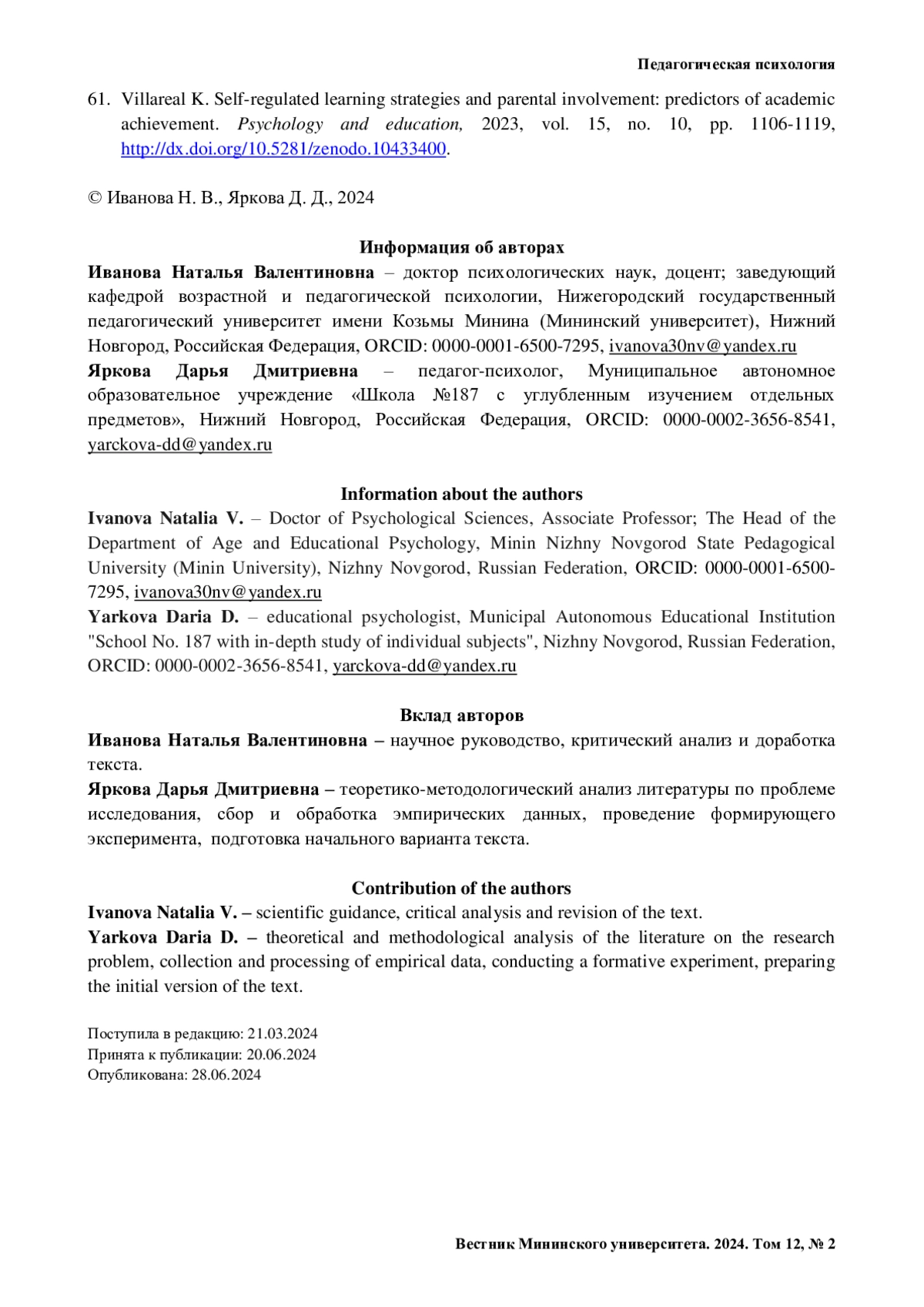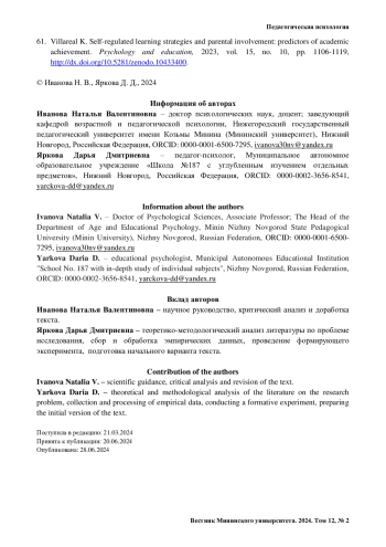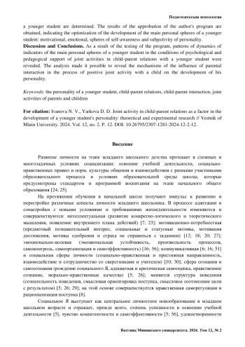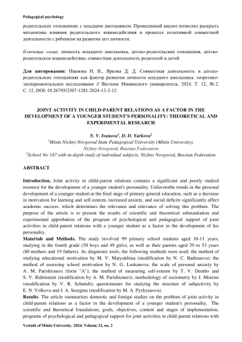 ИВАНОВА Н. В., ЯРКОВА Д. Д. СОВМЕСТНАЯ ДЕЯТЕЛЬНОСТЬ В ДЕТСКОРОДИТЕЛЬСКИХ ОТНОШЕНИЯХ КАК ФАКТОР РАЗВИТИЯ ЛИЧНОСТИ МЛАДШЕГО ШКОЛЬНИКА: ТЕОРЕТИКО-ЭКСПЕРИМЕНТАЛЬНОЕ ИССЛЕДОВАНИЕ // ВЕСТНИК МИНИНСКОГО УНИВЕРСИТЕТА. 2024. ТОМ 12, № 2