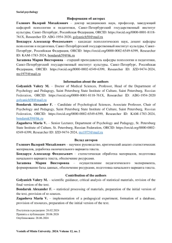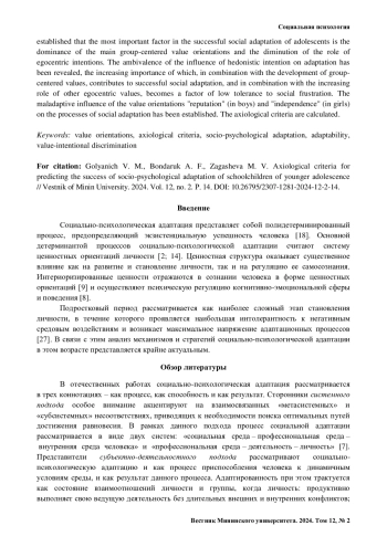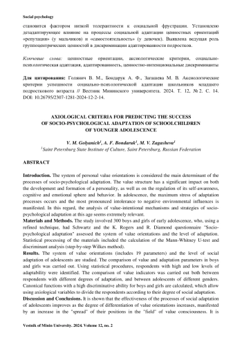ГОЛЯНИЧ В. М., БОНДАРУК А. Ф., ЗАГАШЕВА М. В. АКСИОЛОГИЧЕСКИЕ КРИТЕРИИ УСПЕШНОСТИ СОЦИАЛЬНО-ПСИХОЛОГИЧЕСКОЙ АДАПТАЦИИ ШКОЛЬНИКОВ МЛАДШЕГО ПОДРОСТКОВОГО ВОЗРАСТА // ВЕСТНИК МИНИНСКОГО УНИВЕРСИТЕТА. 2024. ТОМ 12, № 2