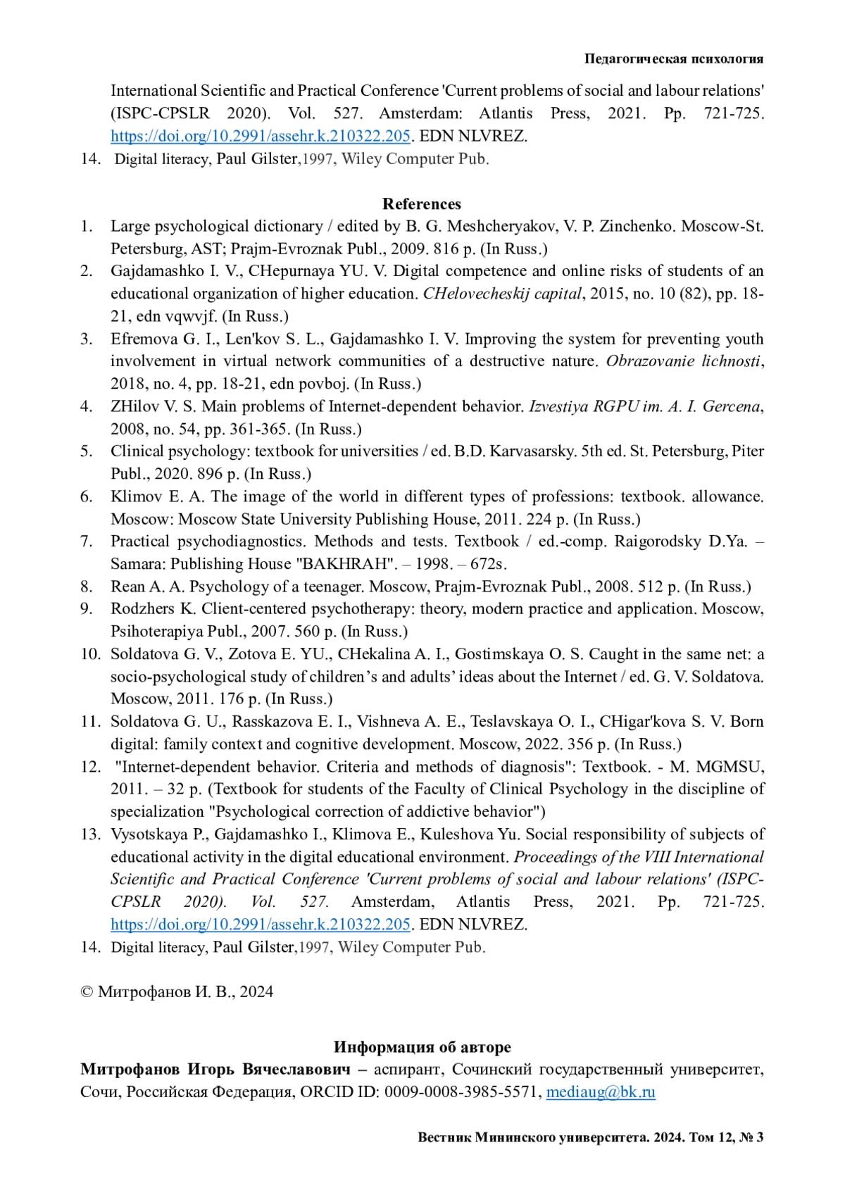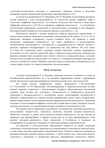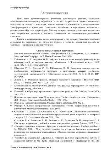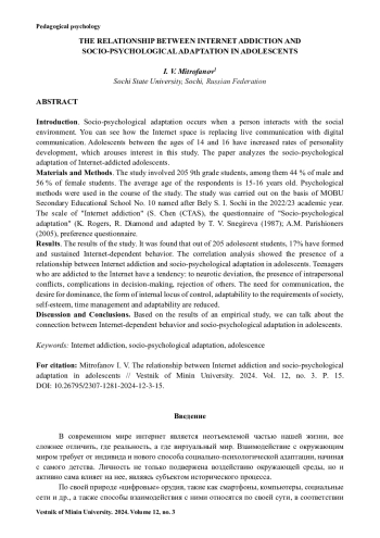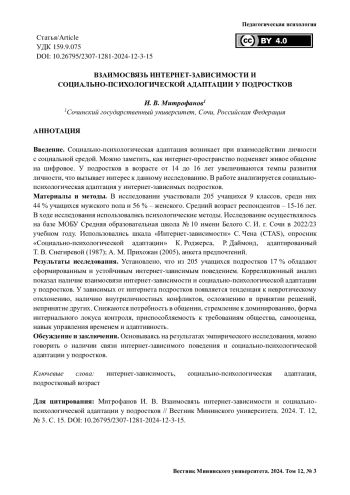 МИТРОФАНОВ И. В. ВЗАИМОСВЯЗЬ ИНТЕРНЕТ-ЗАВИСИМОСТИ И СОЦИАЛЬНО-ПСИХОЛОГИЧЕСКОЙ АДАПТАЦИИ У ПОДРОСТКОВ // ВЕСТНИК МИНИНСКОГО УНИВЕРСИТЕТА. 2024. ТОМ 12, № 3