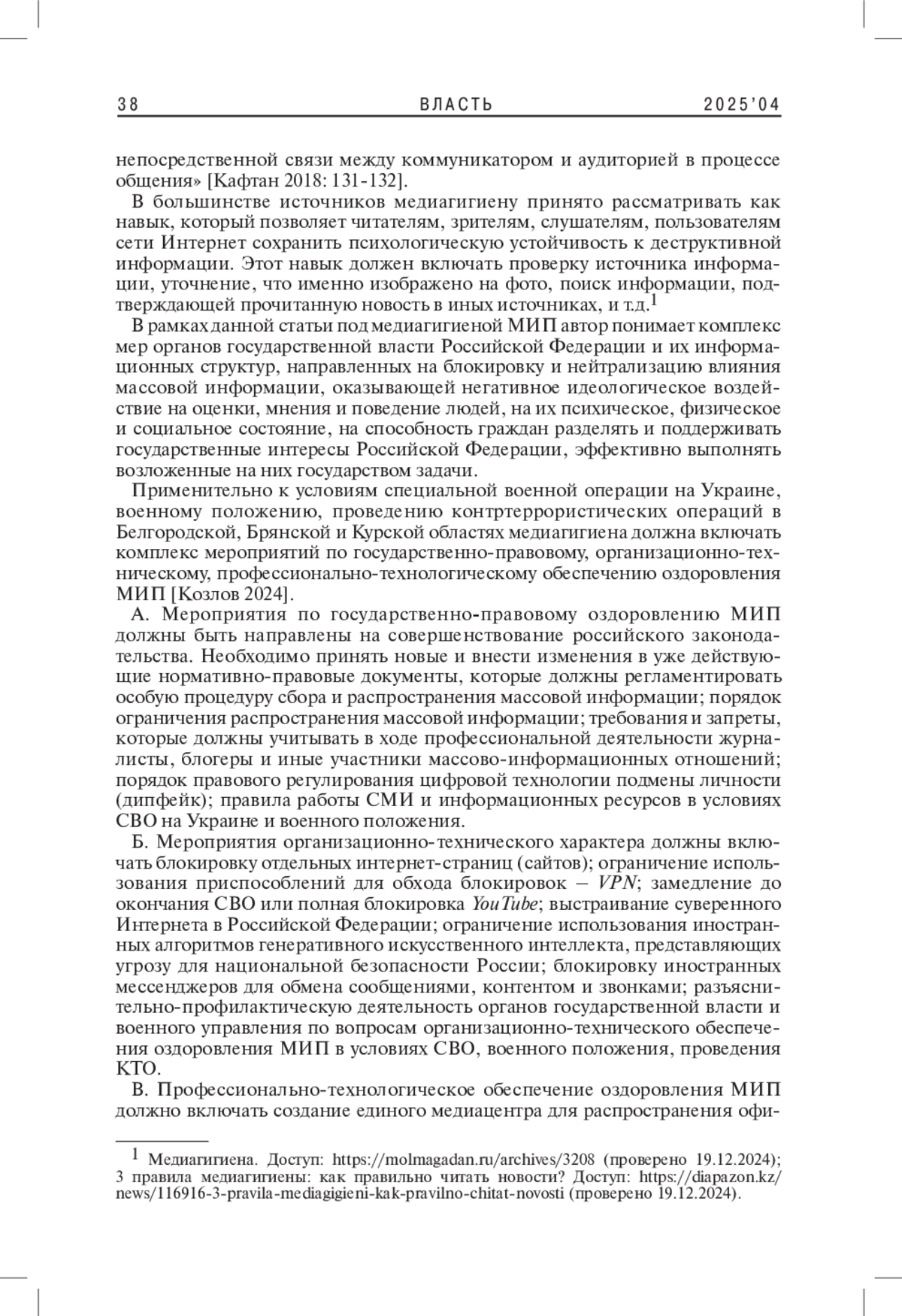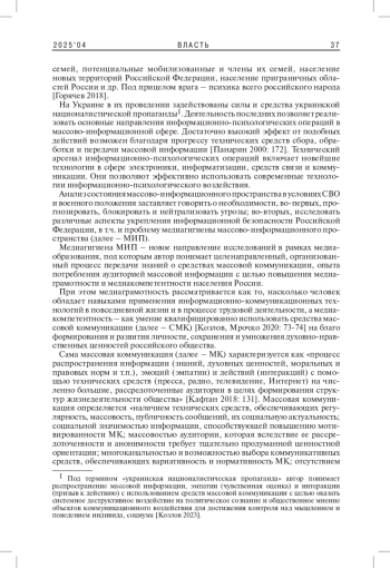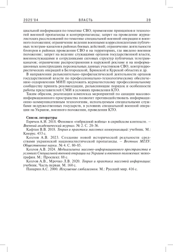 4. Козлов А.В. 2024. Медиагигиена массово-информационного пространства в условиях Специальной военной операции на Украине и военного положения: монография. М.: Проспект. 88 с. EDN: DIGSTI