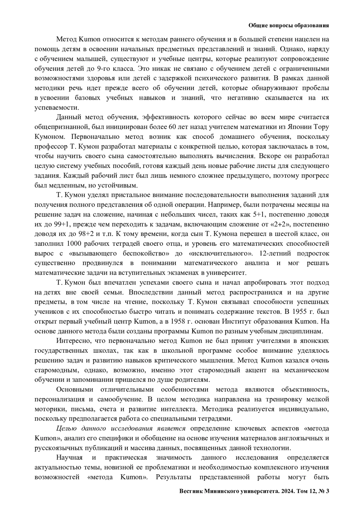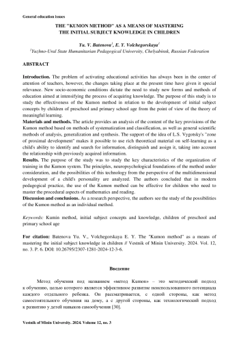 БАТЕНОВА Ю. В., ВОЛЧЕГОРСКАЯ Е. Ю. «МЕТОД KUMON» КАК СРЕДСТВО ОСВОЕНИЯ НАЧАЛЬНЫХ ПРЕДМЕТНЫХ ЗНАНИЙ У ДЕТЕЙ // ВЕСТНИК МИНИНСКОГО УНИВЕРСИТЕТА. 2024. ТОМ 12, № 3