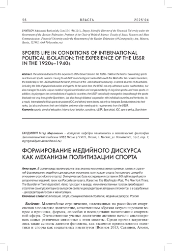 Статья посвящена опыту Советского Союза 1920-1940-х гг. в области преодоления спортивных санкций и спортивной изоляции. Оказавшись после Октябрьской революции в идеологической конфронтации с Западом, руководство СССР выдержало жесткий прессинг тогдашнего «международного сообщества» практически по всем направлениям своей деятельности, в т. ч. в сфере физкультуры и спорта. При этом СССР не только устоял в таком противоборстве, но и сумел выстроить уникальную модель органичного сочетания и взаимодополнения «большого спорта» и спорта массового. Кроме того, за счет игры на противоречиях капиталистических стран СССР периодически удавалось прорывать спортивную блокаду не только по линии Спортинтерна, но и по линии двустороннего сотрудничества с отдельными странами и территориями. В итоге международные официальные спортивные структуры (МОК и др.) были вынуждены не только интегрировать советских спортсменов в свои ряды, но и сделать это в инициативном порядке, да еще после выполнения жестких требований со стороны СССР.