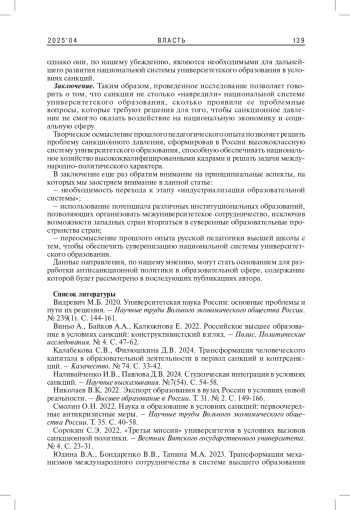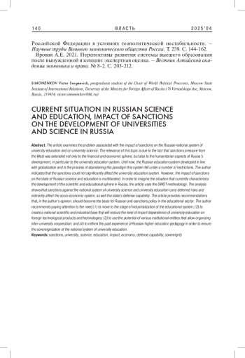 6. Смолин О.Н. 2022. Наука и образование в условиях санкций: первоочередные антикризисные меры. - Научные труды Вольного экономического общества России. Т. 35. С. 40-58. EDN: ZKLJGQ