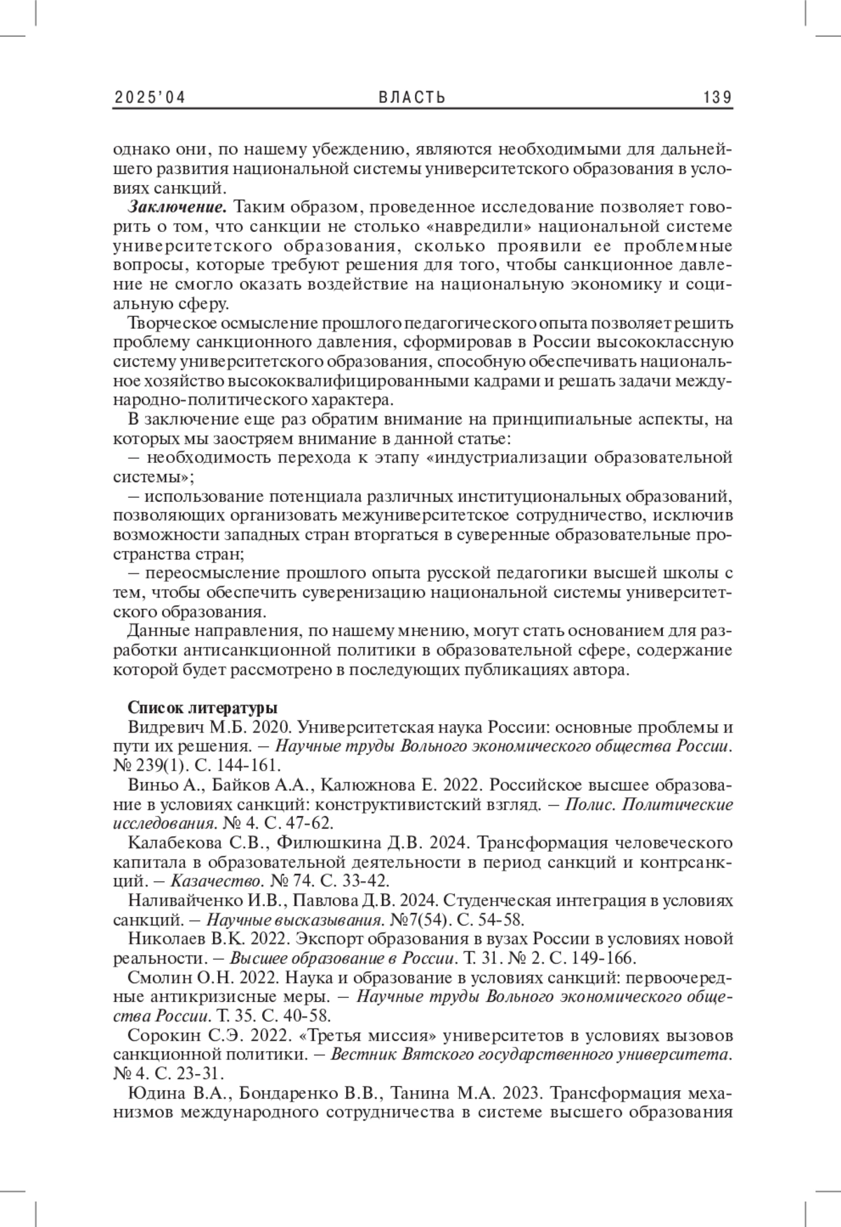 1. Видревич М.Б. 2020. Университетская наука России: основные проблемы и пути их решения. - Научные труды Вольного экономического общества России. № 239(1). С. 144-161.