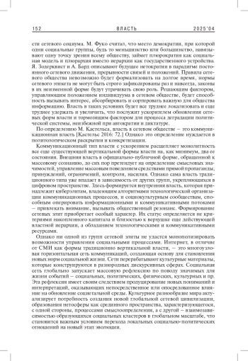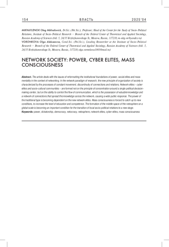 В статье рассматриваются вопросы переформатирования институциональных основ власти, социальных элит и массовой ментальности в условиях сетевизации. В сетевой парадигме исследований новый принцип организации общества характеризуется процессами постоянного движения, прерывности связей и отношений. Сетевые элиты - киберэлиты и социокультурные сообщества - формируются не по принципу концентрации вокруг политического единого центра принятия решений, а по способности управления потоками коммуникации - обладания ценным знанием и сетью связей, распространяющих это знание по сети, вызывая широкий общественный резонанс. Власть традиционного типа впадает в зависимость от новых сетевых элит. Массовое сознание вынуждено подтягиваться к новым условиям, повышать уровень образованности и компетентности. Образование срединного пространства - нетосферы в глобальном масштабе становится важным условием перехода локальных социально-политических отношений на новый этап.
