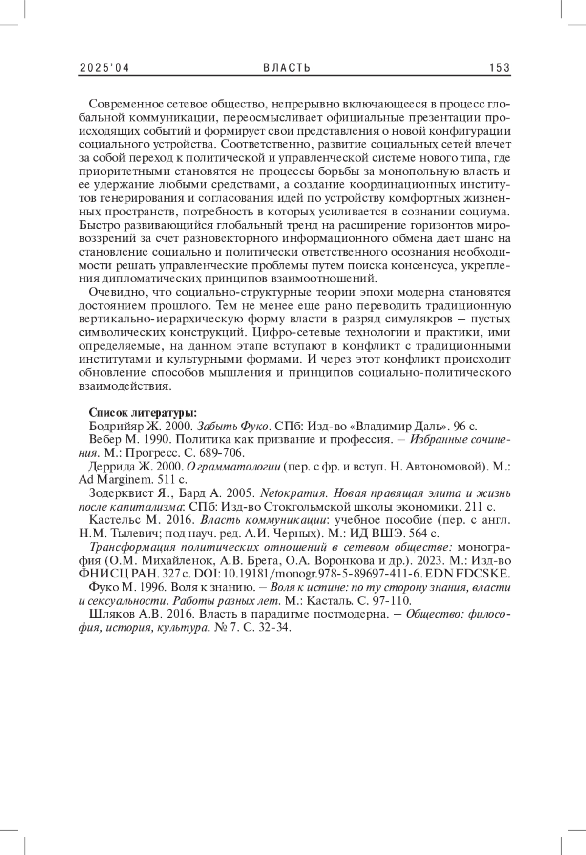 1. Бодрийяр Ж. 2000. Забыть Фуко. СПб: Изд-во “Владимир Даль”. 96 с.