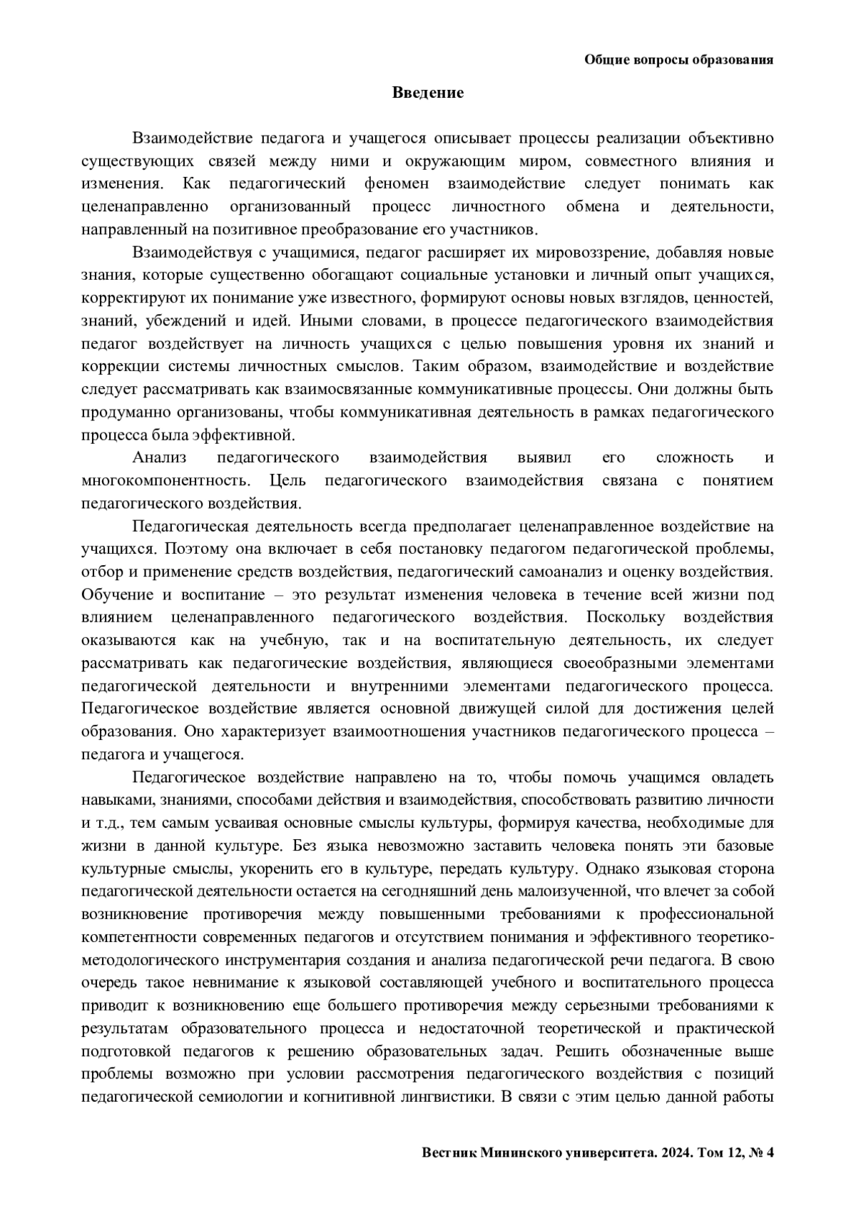 Введение. Педагогическая деятельность всегда предполагает воздействия на учащихся с целью усвоения ими базовых смыслов культуры. Сделать человека носителем этих базовых культурных смыслов, транслировать ему культуру без языка невозможно. Отсутствие исследований языковой стороны педагогической деятельности объясняет существующее противоречие между требованиями к профессиональной компетентности педагогов и отсутствием эффективного инструментария создания и анализа речи педагога. В статье предлагается решение обозначенной проблемы с позиций педагогической семиологии и когнитивной лингвистики. Цель данной работы – рассмотрение теоретических основ языкового педагогического воздействия в трансдисциплинарном ракурсе.