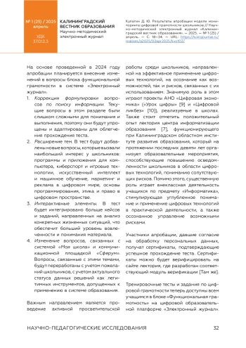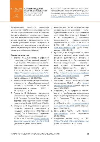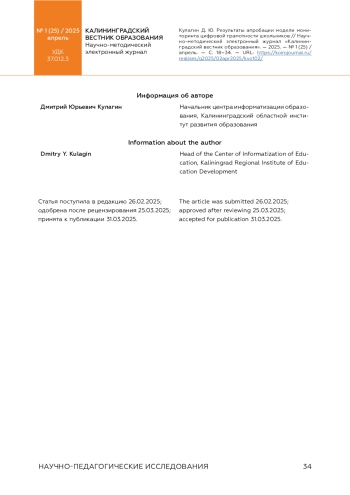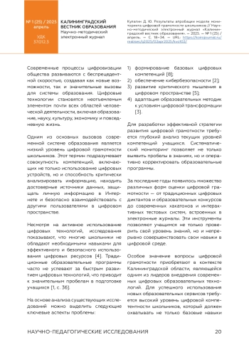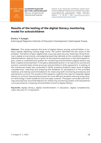 КУЛАГИН Д. Ю. РЕЗУЛЬТАТЫ АПРОБАЦИИ МОДЕЛИ МОНИТОРИНГА ЦИФРОВОЙ ГРАМОТНОСТИ ШКОЛЬНИКОВ // КАЛИНИНГРАДСКИЙ ВЕСТНИК ОБРАЗОВАНИЯ. 2025. № 1 (25)
