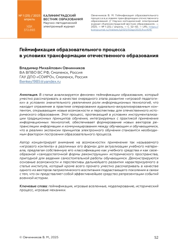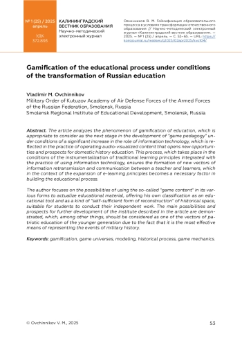 В статье анализируется феномен геймификации образования, который уместно рассматривать в качестве очередного этапа развития «игровой педагогики» в условиях значительного увеличения роли информационных технологий, что находит отражение в практике оперирования аудиально-визуализированным контентом, открывающим новые возможности и перспективы для отечественного исторического образования. Этот процесс, протекающий в условиях инструментализации традиционных принципов обучения, интегрируемых с практикой применения информационных технологий, обеспечивает формирование новых векторов ретрансляции информации и коммуницирования между обучающим и обучающимися, что в реалиях экспансии принципов электронного обучения становится необходимым фактором построения образовательного процесса.