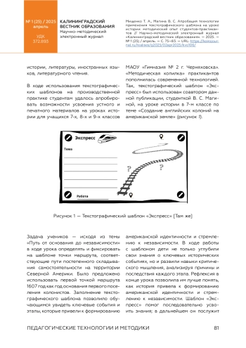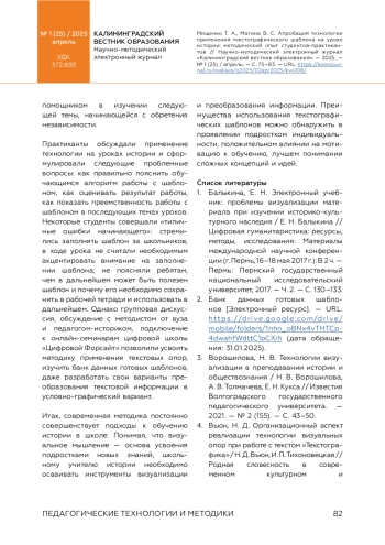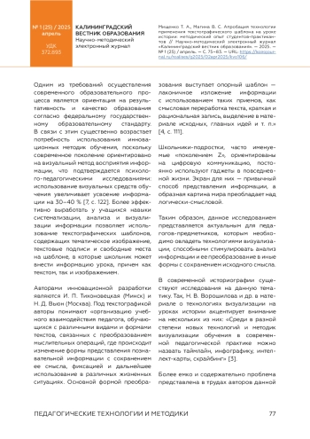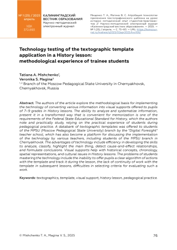 Авторы статьи исследуют методические основы реализации технологии преобразования разнообразной информации, предлагаемой обучающимся на уроке истории в 7–9 классах, в визуальные опоры. Способность анализировать и систематизировать информацию, предъявить ее в преобразованном виде, удобном для запоминания, является одним из требований ФГОС по истории, что отмечают и исследуют авторы, опираясь на практический опыт студентов в ходе производственной практики. Банк данных текстографических шаблонов предложила студентам филиала МПГУ школа учителя «Цифровой Форсайт», которая стала площадкой обсуждения реализации технологии различными педагогами, включая студентов филиала МПГУ в г. Черняховске. К преимуществам технологии следует отнести эффективность в отработке умений анализировать, классифицировать, выделять главное, обнаруживать причинно-следственные связи, формулировать выводы. Визуальные опоры помогают в работе с историческими понятиями, хронологией, пространственными представлениями и вопросами культуры на уроке истории. К проблемам освоения технологии студентами можно отнести неумение предложить школьникам четкий алгоритм действий с шаблоном и отслеживать его в ходе урока, отсутствие преемственности работы с шаблоном на последующих уроках, затруднения при подборе критериев оценивания такой работы.