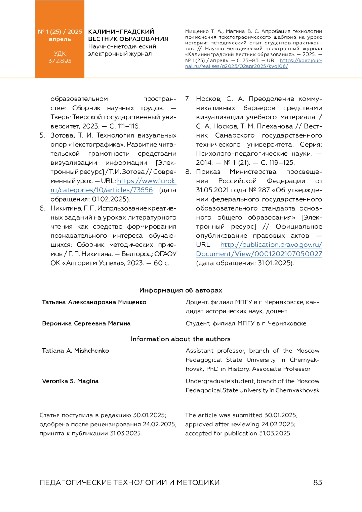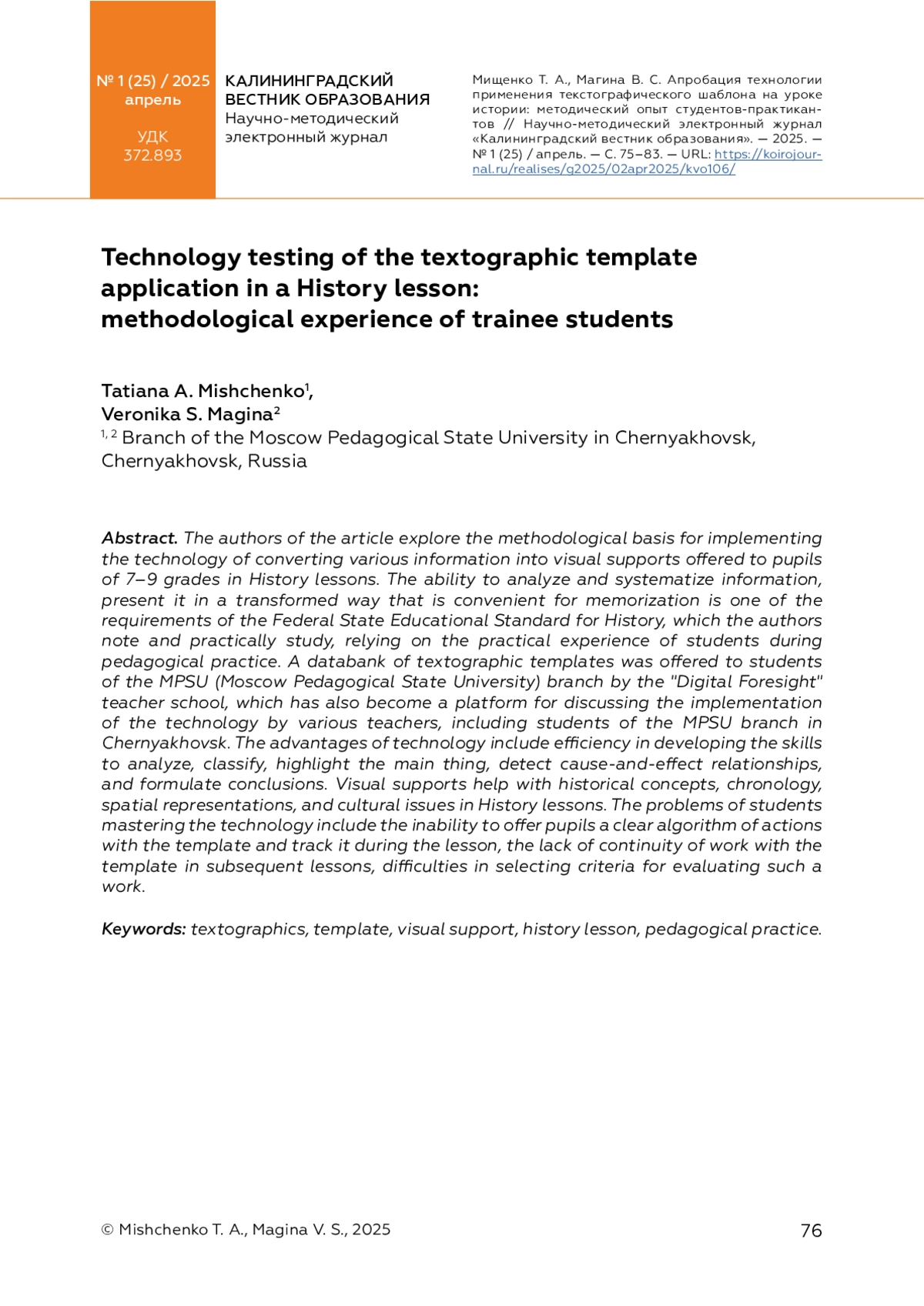 МИЩЕНКО Т. А., МАГИНА В. С. АПРОБАЦИЯ ТЕХНОЛОГИИ ПРИМЕНЕНИЯ ТЕКСТОГРАФИЧЕСКОГО ШАБЛОНА НА УРОКЕ ИСТОРИИ: МЕТОДИЧЕСКИЙ ОПЫТ СТУДЕНТОВ-ПРАКТИКАНТОВ // КАЛИНИНГРАДСКИЙ ВЕСТНИК ОБРАЗОВАНИЯ. 2025. № 1 (25)