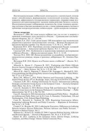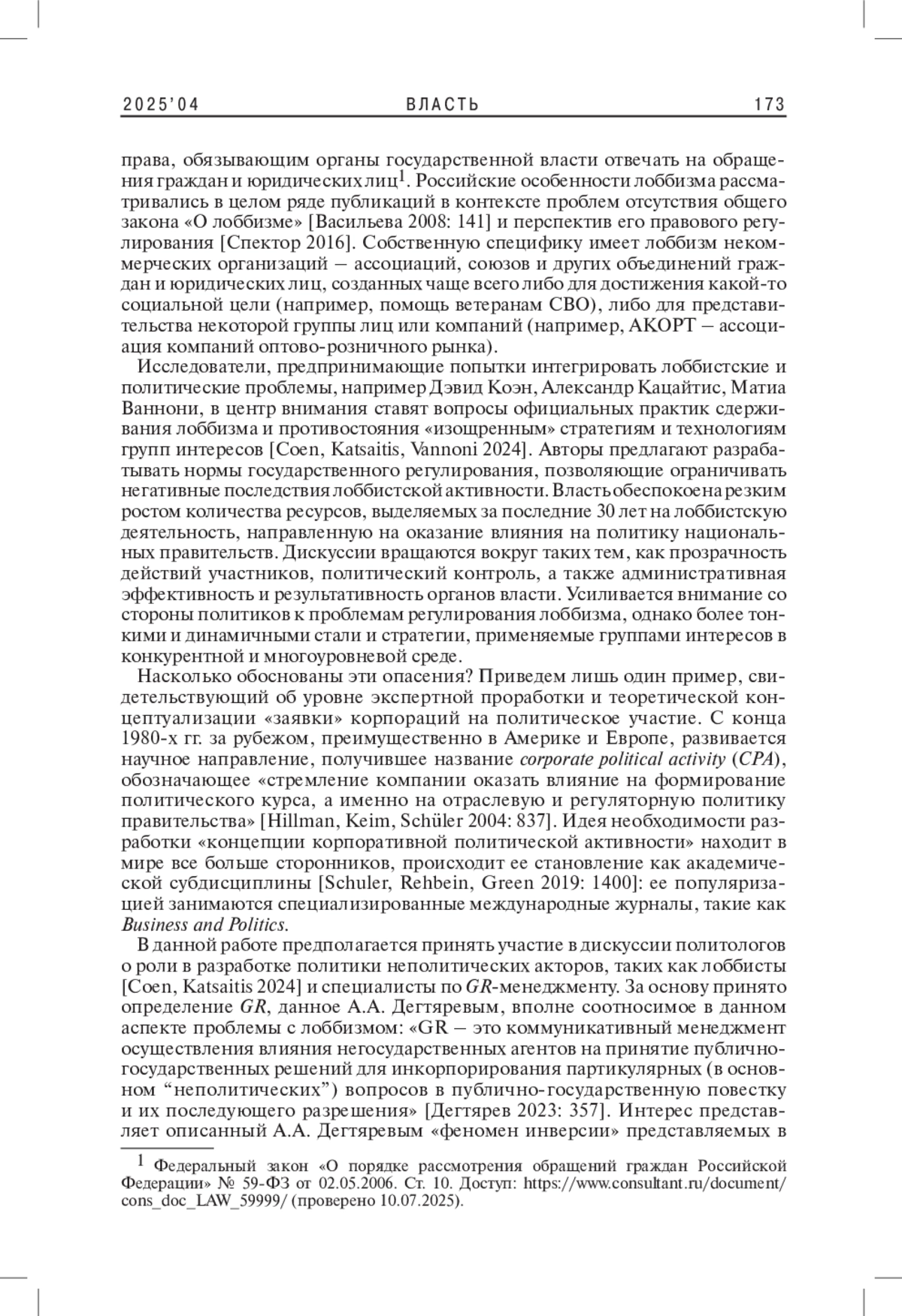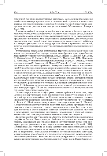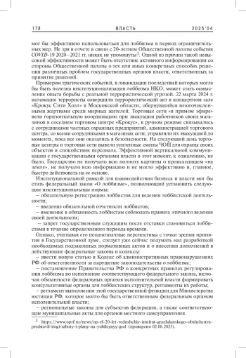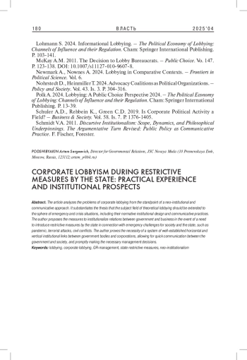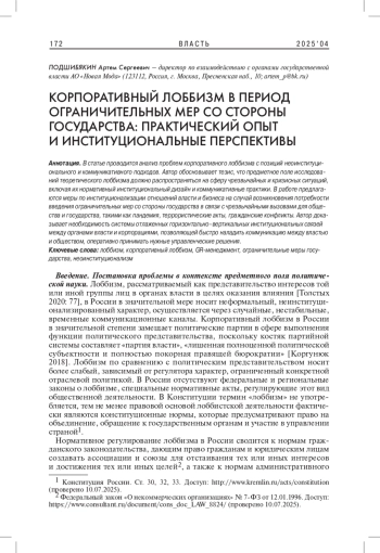 ПОДШИБЯКИН А. С. КОРПОРАТИВНЫЙ ЛОББИЗМ В ПЕРИОД ОГРАНИЧИТЕЛЬНЫХ МЕР СО СТОРОНЫ ГОСУДАРСТВА: ПРАКТИЧЕСКИЙ ОПЫТ И ИНСТИТУЦИОНАЛЬНЫЕ ПЕРСПЕКТИВЫ // ВЛАСТЬ. 2025. ТОМ 33 № 4