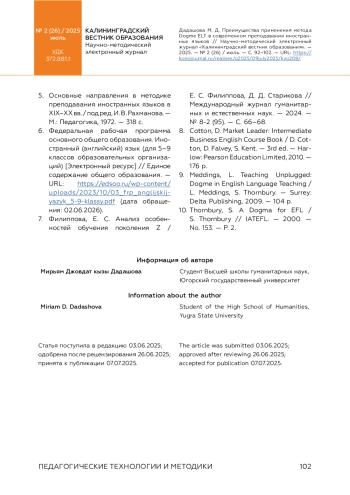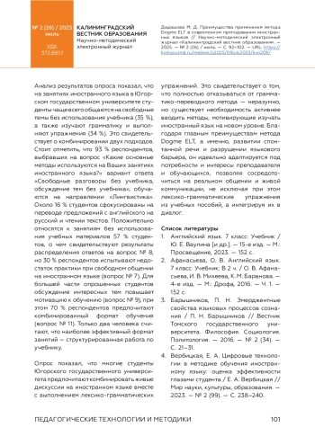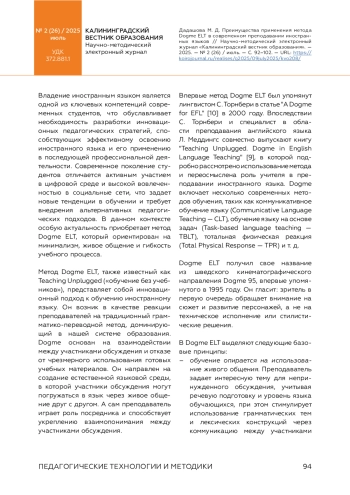В статье рассматриваются теоретико-методологические основания внедрения метода Dogme ELT в современную систему преподавания иностранного языка. Целью исследования является рассмотрение метода Dogme ELT как современного и актуального подхода к обучению, а также выявление его практических преимуществ при интеграции в учебный процесс вуза, в частности, в Югорском государственном университете. Особое внимание уделяется выявлению противоречий между школьной и вузовской языковой подготовкой, а также анализу несоответствия целей и методик преподавания на разных уровнях образования. Уточняется специфика грамматико-переводного метода, широко распространенного в системе общего образования, и обосновываются его ограничения в контексте формирования коммуникативной компетенции у студентов. Выявляются характерные признаки метода Dogme ELT, такие как гибкость, минимизация учебных материалов, ориентация на спонтанную речь и опора на речевой опыт обучающихся в качестве актуальной альтернативы традиционному подходу. Представлены результаты опроса студентов Югорского государственного университета, свидетельствующие о высокой мотивационной и практико-ориентированной эффективности Dogme ELT. В статье делается акцент на целесообразности включения элементов данного метода в образовательную программу вуза для интенсификации речевой активности, повышения учебной автономии студентов и формирования устойчивой заинтересованности в изучении иностранного языка как средства межкультурной коммуникации. Результаты, описанные в исследовании, могут представлять интерес для преподавателей, методистов, аспирантов, магистрантов, а также для руководителей образовательных программ, стремящихся повысить качество преподавания иностранных языков.