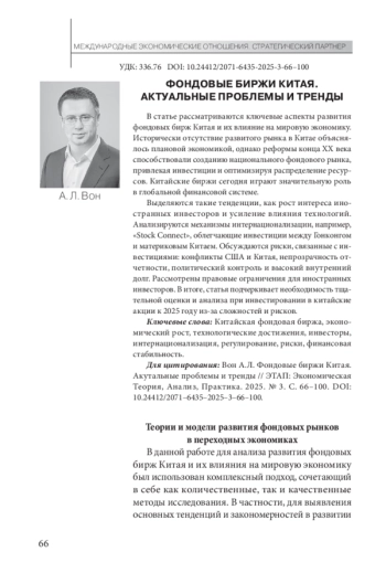 ВОН А.Л. ФОНДОВЫЕ БИРЖИ КИТАЯ. АКТУАЛЬНЫЕ ПРОБЛЕМЫ И ТРЕНДЫ // ЭТАП: ЭКОНОМИЧЕСКАЯ ТЕОРИЯ, АНАЛИЗ, ПРАКТИКА. 2025. № 3