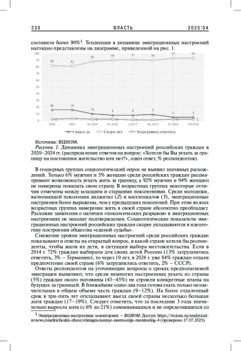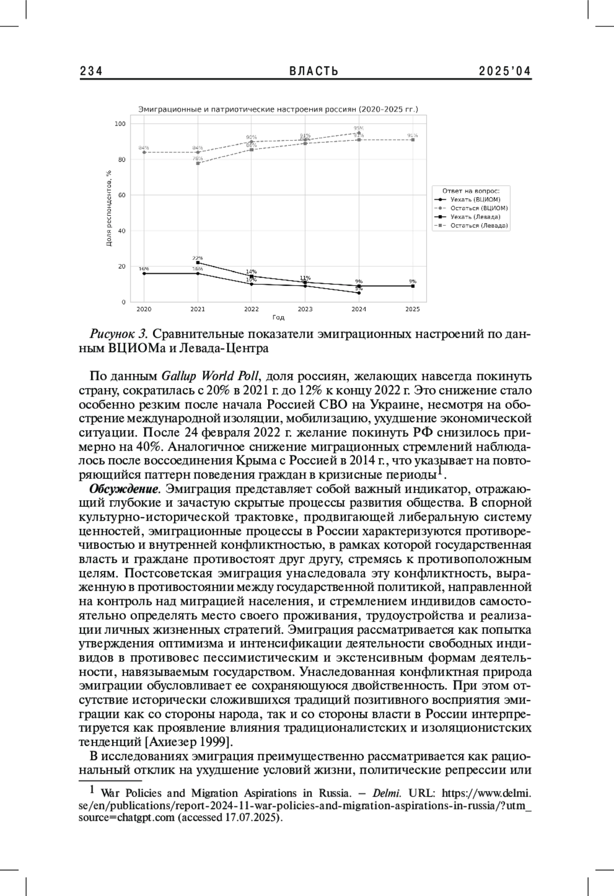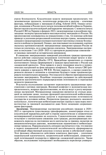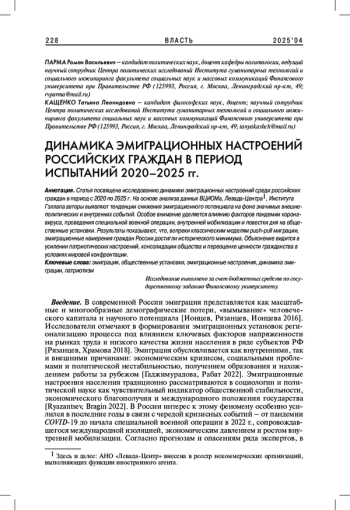 ПАРМА Р. В., КАЩЕНКО Т. Л. ДИНАМИКА ЭМИГРАЦИОННЫХ НАСТРОЕНИЙ РОССИЙСКИХ ГРАЖДАН В ПЕРИОД ИСПЫТАНИЙ 2020-2025 ГГ. // ВЛАСТЬ. 2025. ТОМ 33 № 4