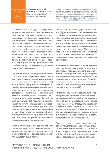 6. Михалева, Е. С. Конкурсное движение как одно из направлений повышения профессионального мастерства педагогических работников [Электронный ресурс] / Е. С. Михалева // Информационно-методический журнал «Про_ДОД». - 2022. - № 5 (41). - С. 40-51. - URL: https://prodod.moscow/wp-content/uploads/Pro_DOD_October_2022_new_5-1.pdf (дата обращения: 24.06.2025).