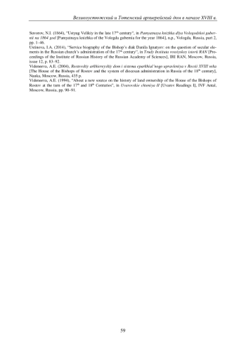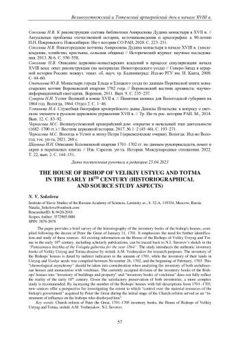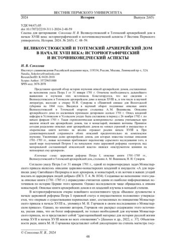 СОКОЛОВА Н. В. ВЕЛИКОУСТЮЖСКИЙ И ТОТЕМСКИЙ АРХИЕРЕЙСКИЙ ДОМ В НАЧАЛЕ XVIII ВЕКА: ИСТОРИОГРАФИЧЕСКИЙ И ИСТОЧНИКОВЕДЧЕСКИЙ АСПЕКТЫ // ВЕСТНИК ПЕРМСКОГО УНИВЕРСИТЕТА. ИСТОРИЯ. 2024. № 2 (65)