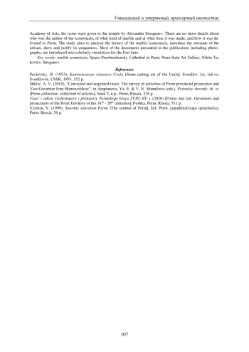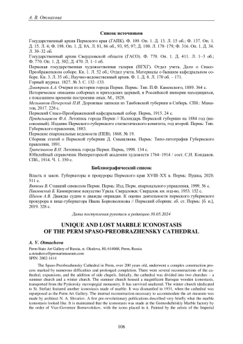Пермский Спасо-Преображенский кафедральный собор имеет более чем 200-летнюю историю. Он часто и много перестраивался, расширялся, добавлялись приделы. Изначально собор делился на два храма: летний и зимний. В летнем был установлен сохранившийся до наших дней барочный деревянный иконостас, привезенный из Пыскорского ставропигиального монастыря; второй иконостас в зимнем, Стефановском, храме был выполнен из мрамора. Он был разобран после передачи здания собора в 1931 г. для нужд Пермской художественной галереи. По проекту архитектора Н. А. Шварёва была сделана внутренняя реконструкция, необходимая для размещения художественного музея. О том, что представлял собой мраморный иконостас, писали очень кратко в дореволюционных изданиях. Упоминалось, что он был сделан по заказу вице-губернатора И. М. Борноволокова на Горнощитском мраморном заводе. Говорилось также о размещенных в нем иконах кисти художников Императорской академии художеств, дарованных А. С. Строгановым. Однако знаний в деталях о том, кто был автором, мастером иконостаса, из каких точно видов мрамора и в какие сроки он был сделан, как доставлен в Пермь, на данный момент не сохранилось. В публикуемой статье предпринимается попытка реконструировать историю создания мраморного иконостаса, обосновать авторство его создателя, дать общую характеристику объекта и доказать его уникальность. Большинство документов, использованных в публикации, в том числе и фотографии, вводятся в научный оборот впервые.