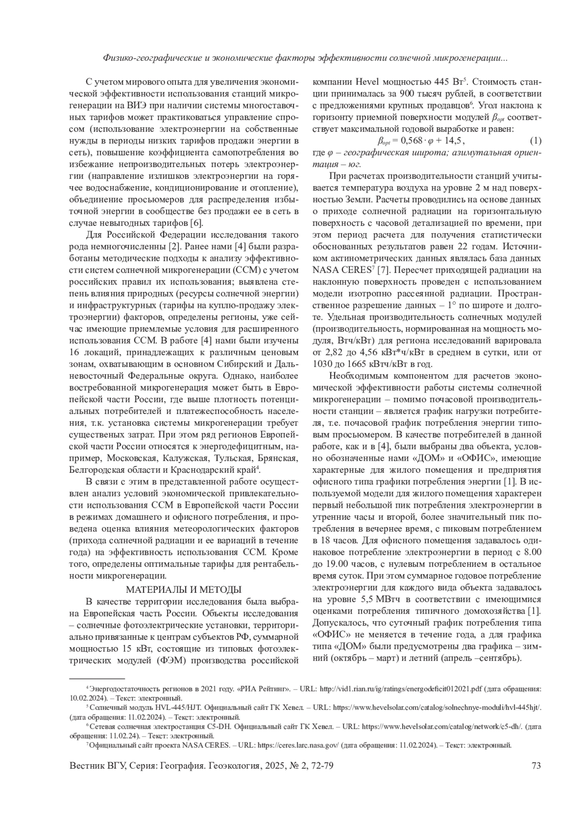 Статья: ФИЗИКО-ГЕОГРАФИЧЕСКИЕ И ЭКОНОМИЧЕСКИЕ ФАКТОРЫ ЭФФЕКТИВНОСТИ СОЛНЕЧНОЙ МИКРОГЕНЕРАЦИИ В ЕВРОПЕЙСКОЙ ЧАСТИ РОССИИ (2025)