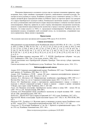 Ключевые фразы: оренбургские казаки, ЧЕЛЯБИНСК, социальные изменения, социальная история, МИГРАЦИОННЫЕ ПРОЦЕССЫ