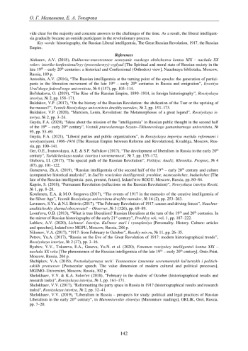2. Антошин А.В. Русская интеллигенция на переломе эпох: поколение участников освободительного движения конца XIX - начала ХХ в. в России и эмиграции // Изв. Урал. федер. ун-та. Гуманитарные науки. 2016. Т. 18, № 4 (157). С. 103-114. DOI: 10.15826/izv2.2016.18.4.068