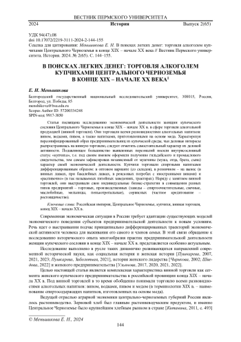 1. Абдрахманов К.А. Торговля алкоголем как сфера купеческого предпринимательства в Оренбургском крае во второй половине XIX - начале XX веков // Современные исследования социальных проблем. 2016. № 3-2 (27). С. 7-28.