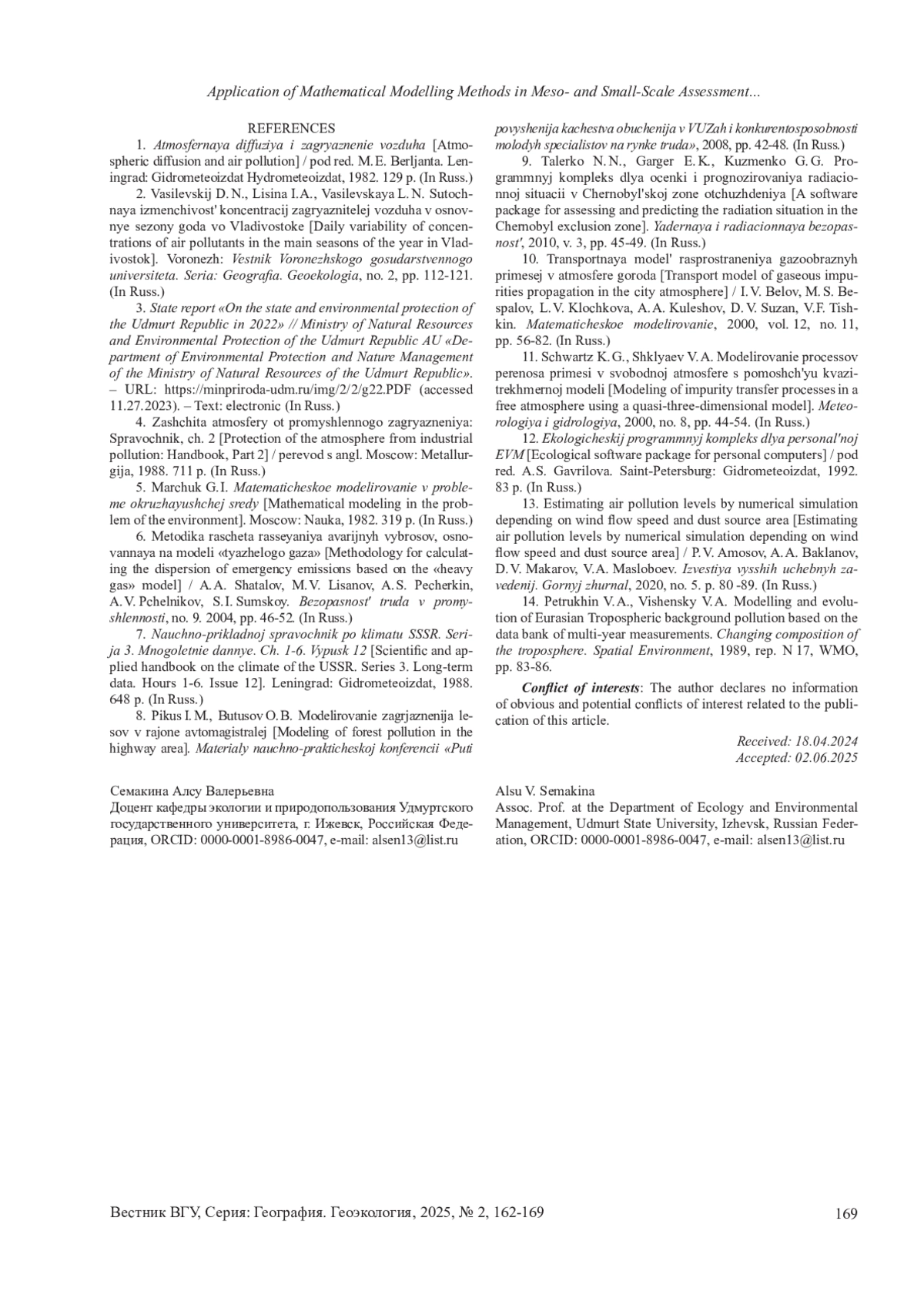 СЕМАКИНА А. В. ПРИМЕНЕНИЕ МЕТОДОВ МАТЕМАТИЧЕСКОГО МОДЕЛИРОВАНИЯ ПРИ МЕЗО- И МЕЛКОМАСШТАБНОЙ ОЦЕНКЕ СОСТОЯНИЯ АТМОСФЕРНОГО ВОЗДУХА // ВЕСТНИК ВОРОНЕЖСКОГО ГОСУДАРСТВЕННОГО УНИВЕРСИТЕТА. СЕРИЯ: ГЕОГРАФИЯ. ГЕОЭКОЛОГИЯ. 2025. № 2