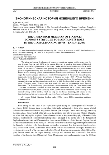 Статья посвящена развитию Лондона в качестве мирового и национального банковского центра на протяжении последних 50 лет - от начала 1970-х гг. до настоящего времени. В основу исследования положены большие массивы исторической статистики, систематизированные и обработанные автором. Лондон, являвшийся крупнейшим банковским центром мира в XIX - начале XX вв., в дальнейшем постепенно сдавал свои позиции; к 1970 г. он занимал только третье место в глобальной иерархии. Новые факторы, проявившиеся в 1970-е гг. (например, кризис Бреттон-Вудской валютной системы) способствовали дальнейшему отступлению Лондона. На следующем историческом этапе ситуация резко изменилась в результате дерегулирования национальной финансовой системы, проведенного консервативными правительствами М. Тэтчер и Дж. Мейджора (1979-1997), а также «новыми лейбористами» Т. Блэра (1997-2007). Пользуясь новым уровнем предпринимательской свободы, британские банки существенно расширили масштабы и направления своей деятельности. В 2008 г. Лондон занимал второе место в мире по активам банковских корпораций. Однако это достижение в значительной мере было связано с перепроизводством рискованных финансовых инструментов. Банковская система Великобритании пережила тяжелый спад во время Великой рецессии 2008-2009 гг. Вместе с тем основные проблемы были тогда сконцентрированы не в Лондоне, где банки оставались относительно стабильными, а в Эдинбурге. В дальнейшем лондонские корпорации возглавили процесс оздоровления национальной банковской системы. Лондон, давно утративший абсолютное лидерство, все же остается очень важным финансовым узлом и уверенно входит в число пяти - шести крупнейших банковских центров мира.