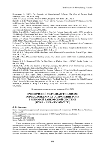 20. Schenk C.R. Summer in the City: Banking Failures of 1974 and the Development of International Banking Supervision // English Historical Review. 2014. Vol. 129, iss. 540. P. 1129-1156.
