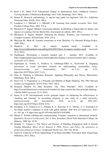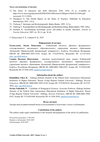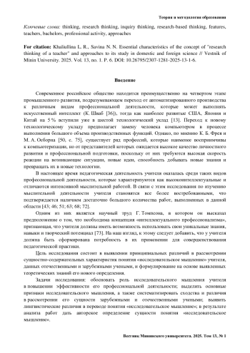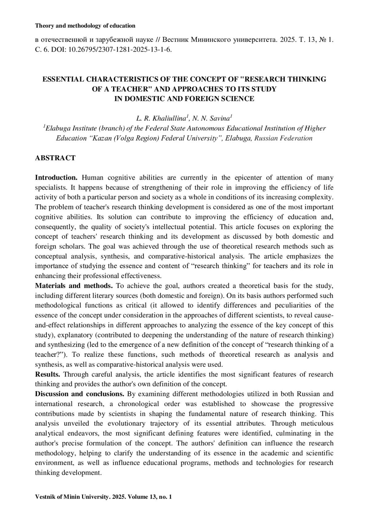 ХАЛИУЛЛИНА Л. Р., САВИНА Н. Н. СУЩНОСТНО-СОДЕРЖАТЕЛЬНЫЕ ХАРАКТЕРИСТИКИ ПОНЯТИЯ «ИССЛЕДОВАТЕЛЬСКОЕ МЫШЛЕНИЕ УЧИТЕЛЯ» И ПОДХОДЫ К ЕГО ИЗУЧЕНИЮ В ОТЕЧЕСТВЕННОЙ И ЗАРУБЕЖНОЙ НАУКЕ // ВЕСТНИК МИНИНСКОГО УНИВЕРСИТЕТА. 2025. ТОМ 13, № 1