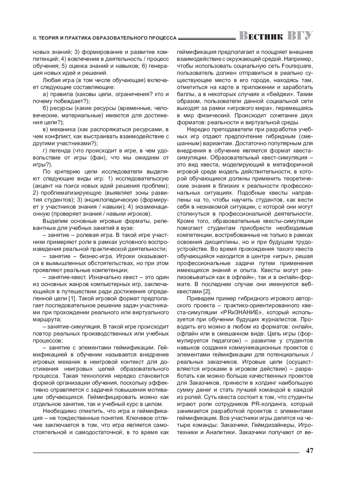 КУРГАНОВА Е. Б. ИГРОВЫЕ ТЕХНОЛОГИИ В ОБУЧЕНИИ: ФОРМАТЫ И ЭЛЕМЕНТЫ // ВЕСТНИК ВОРОНЕЖСКОГО ГОСУДАРСТВЕННОГО УНИВЕРСИТЕТА. СЕРИЯ: ПРОБЛЕМЫ ВЫСШЕГО ОБРАЗОВАНИЯ. 2024. № 4