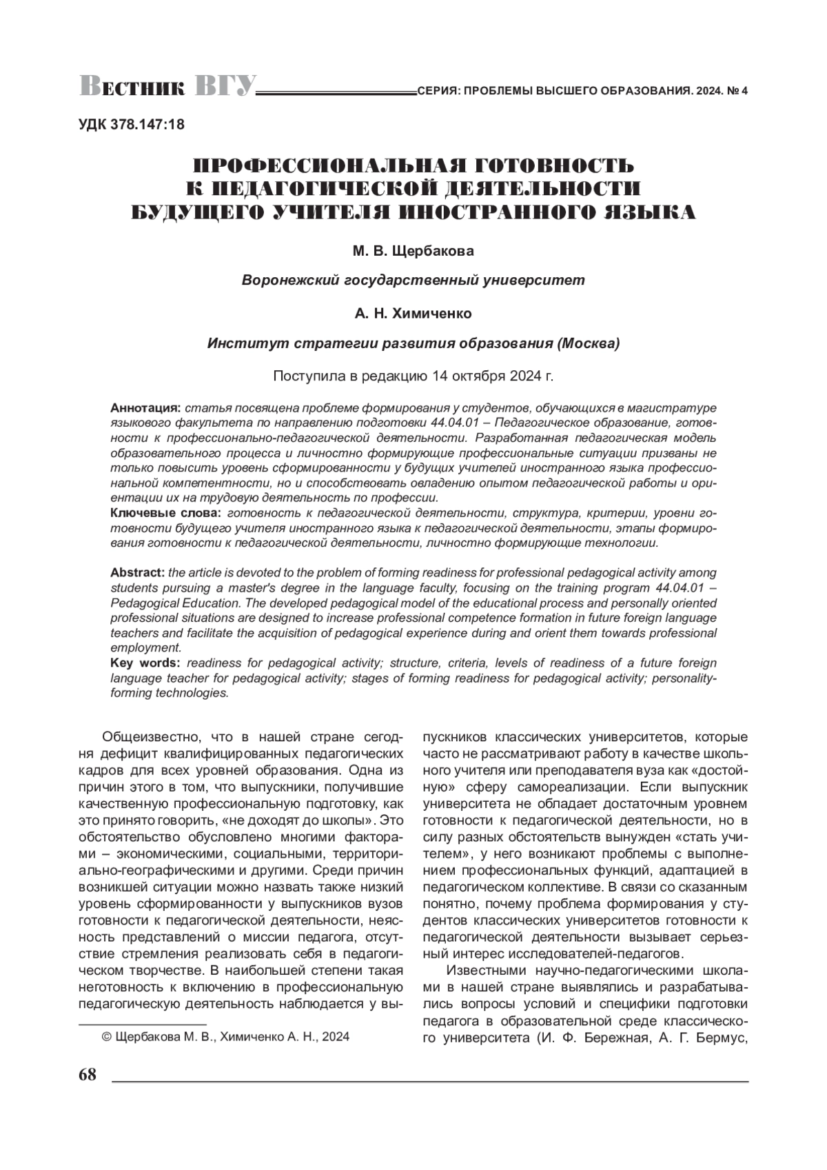 ЩЕРБАКОВА М. В., ХИМИЧЕНКО А. Н. ПРОФЕССИОНАЛЬНАЯ ГОТОВНОСТЬ К ПЕДАГОГИЧЕСКОЙ ДЕЯТЕЛЬНОСТИ БУДУЩЕГО УЧИТЕЛЯ ИНОСТРАННОГО ЯЗЫКА // ВЕСТНИК ВОРОНЕЖСКОГО ГОСУДАРСТВЕННОГО УНИВЕРСИТЕТА. СЕРИЯ: ПРОБЛЕМЫ ВЫСШЕГО ОБРАЗОВАНИЯ. 2024. № 4