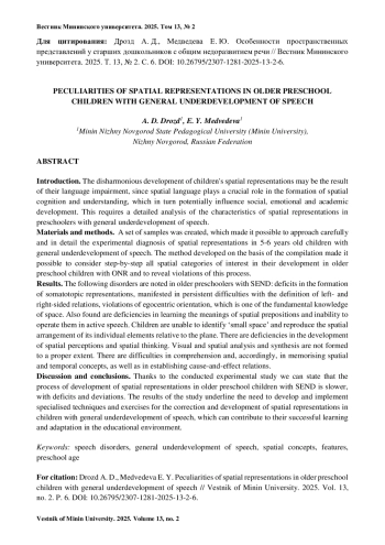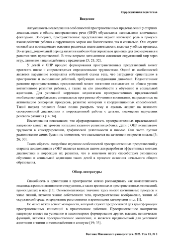 Введение. Дисгармоничное развитие пространственных представлений у детей может быть результатом их языковых нарушений, поскольку пространственный язык играет решающую роль в формировании пространственного познания и понимания, которые, в свою очередь, потенциально влияют на социальное, эмоциональное и академическое развитие. Это требует детального анализа характеристик пространственных представлений у дошкольников с общим недоразвитием речи.
