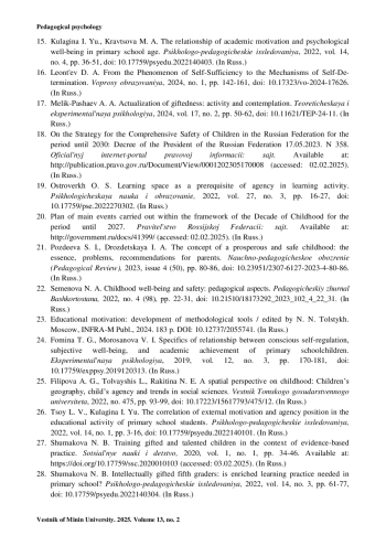 15. Кулагина И. Ю., Кравцова М. А. Связь учебной мотивации и психологического благополучия в младшем школьном возрасте // Психолого-педагогические исследования. 2022. Т. 14, № 4. C. 36-51. https://doi.org/10.17759/psyedu.2022140403.