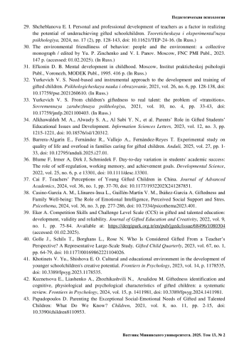 42. Kuznetsova E., Liashenko A., Zhozhikashvili N., Arsalidou M. Giftedness identification and cognitive, physiological and psychological characteristics of gifted children: a systematic review // Frontiers in Psychology. 2024. Vol. 15. Р. 1411981. https://doi.org/10.3389/fpsyg.2024.1411981.