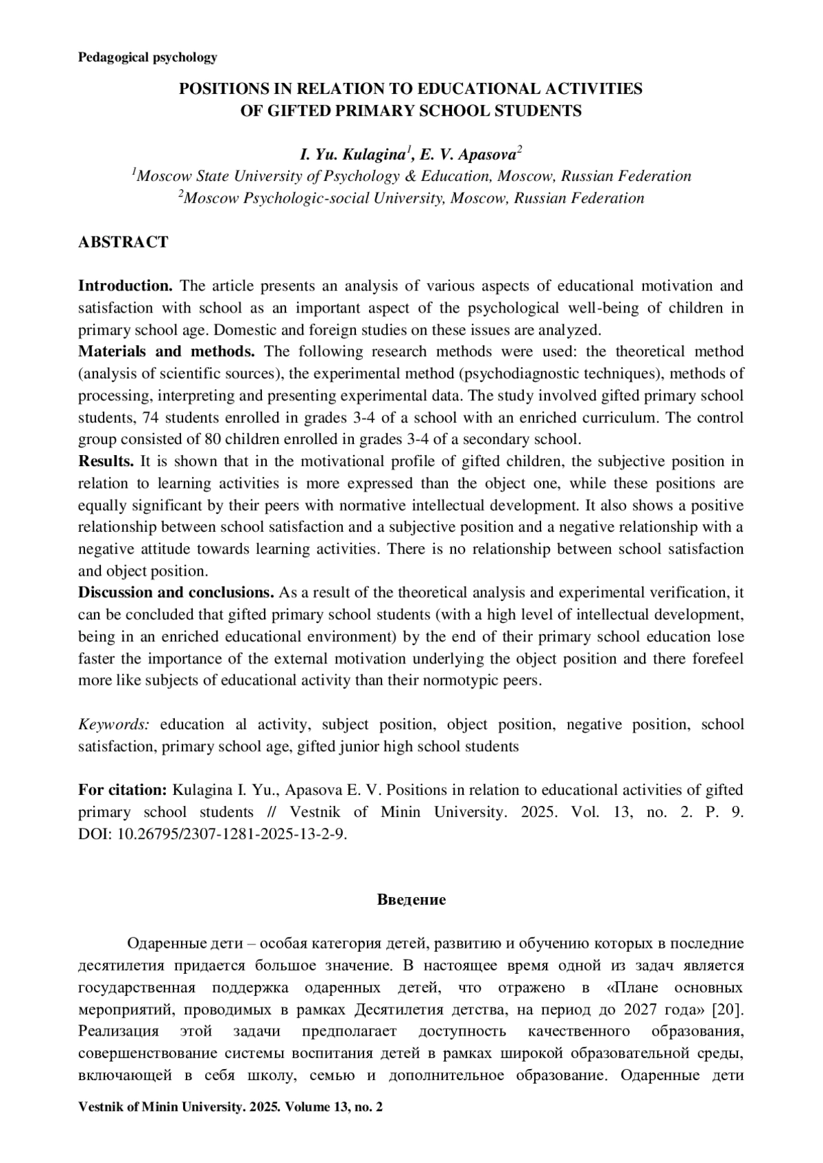 14. Кулагина И. Ю., Апасова Е. В. Позиции по отношению к учебной деятельности в младшем школьном возрасте // Актуальные проблемы психологического знания. 2024. № 4 (69). С. 329-343. https://doi.org/10.51944/20738544_2024_4_329.