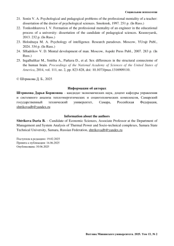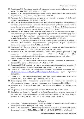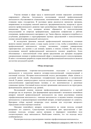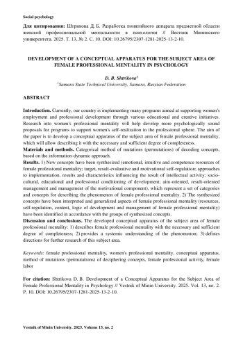 ШТРИКОВА Д. Б. РАЗРАБОТКА ПОНЯТИЙНОГО АППАРАТА ПРЕДМЕТНОЙ ОБЛАСТИ ЖЕНСКОЙ ПРОФЕССИОНАЛЬНОЙ МЕНТАЛЬНОСТИ В ПСИХОЛОГИИ // ВЕСТНИК МИНИНСКОГО УНИВЕРСИТЕТА. 2025. ТОМ 13, № 2