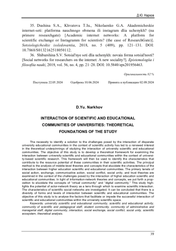 35. Душина, С.А. Академические интернет-сети: платформа научного обмена или инстаграм для ученых? (на примере researchgate) / С.А. Душина, Т.Ю. Хватова, Г.А. Николаенко // Социологические исследования. - 2018. - № 5(409). - С. 121-131. DOI: 10.7868/S0132162518050112 EDN: URNLXS