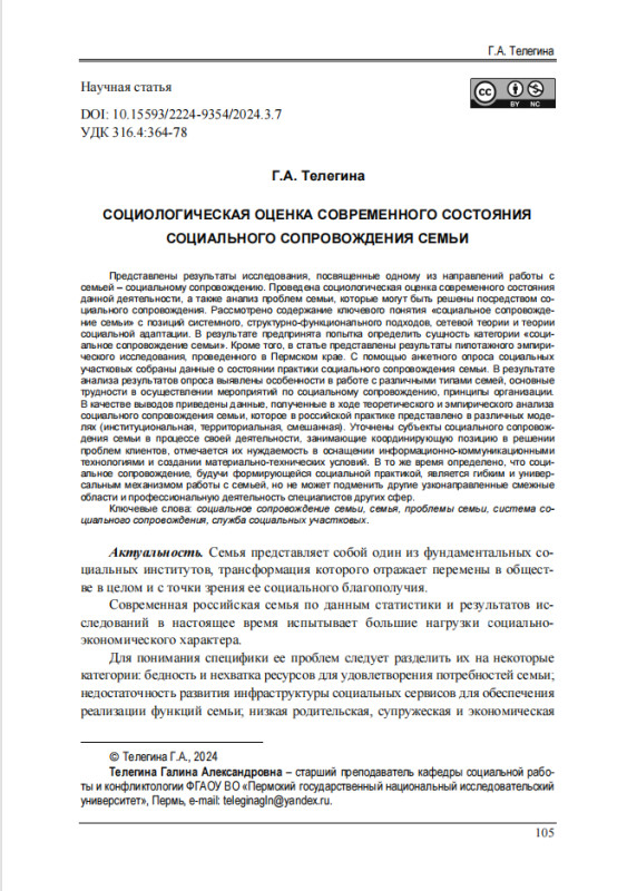 Представлены результаты исследования, посвященные одному из направлений работы с семьей - социальному сопровождению. Проведена социологическая оценка современного состояния данной деятельности, а также анализ проблем семьи, которые могут быть решены посредством социального сопровождения. Рассмотрено содержание ключевого понятия «социальное сопровождение семьи» с позиций системного, структурно-функционального подходов, сетевой теории и теории социальной адаптации. В результате предпринята попытка определить сущность категории «социальное сопровождение семьи». Кроме того, в статье представлены результаты пилотажного эмпирического исследования, проведенного в Пермском крае. С помощью анкетного опроса социальных участковых собраны данные о состоянии практики социального сопровождения семьи. В результате анализа результатов опроса выявлены особенности в работе с различными типами семей, основные трудности в осуществлении мероприятий по социальному сопровождению, принципы организации. В качестве выводов приведены данные, полученные в ходе теоретического и эмпирического анализа социального сопровождения семьи, которое в российской практике представлено в различных моделях (институциональная, территориальная, смешанная). Уточнены субъекты социального сопровождения семьи в процессе своей деятельности, занимающие координирующую позицию в решении проблем клиентов, отмечается их нуждаемость в оснащении информационно-коммуникационными технологиями и создании материально-технических условий. В то же время определено, что социальное сопровождение, будучи формирующейся социальной практикой, является гибким и универсальным механизмом работы с семьей, но не может подменить другие узконаправленные смежные области и профессиональную деятельность специалистов других сфер.